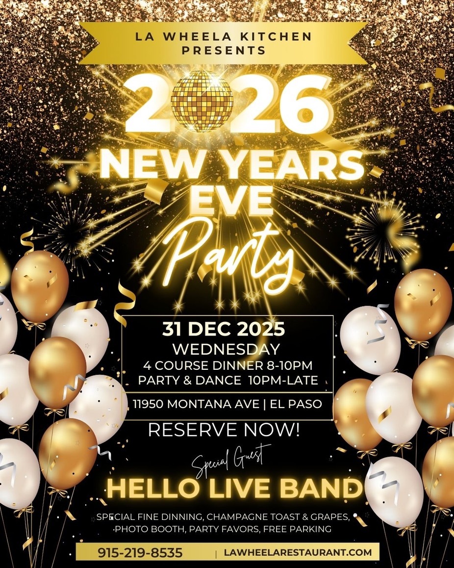 El Paso...get ready for a the most unforgettable New Year's Eve! La Wheela Kitchen presents the 2026 New Year's Eve Party - a night of sparkle, flavor, music, and pure celebration!